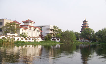 也许是相邻为伴,湖光塔影衬托了校园的美丽,也许是名人辈出,地以人传,更显示了景物的风雅。不管怎么说,二者互相依托,彼此渗透,共同展示了楚州悠久深厚的文化风貌。年岁稍长的都知道,原先二者是合一的,正是“校中有园,园中有校”。只是在1981年,原淮安县人民政府修建勺湖公园,一堵长约300米的白身青檐云龙墙才将校与园隔开,市府曾一度将勺湖公园又划归学校。其实,不管是否有云墙相隔,二者的历史文化总是一脉相通的。