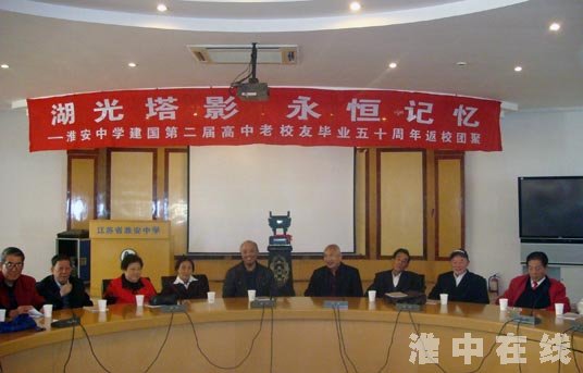 10月18日,文通中学校门口横幅高悬,欢迎校友回母校的宣传牌十分醒目。在秋高气爽、硕果累累的金秋十月,江苏省淮安中学建国第二届高中校友30多人从祖国各地回到了阔别50年的母校,再叙同学谊,重温母校情。