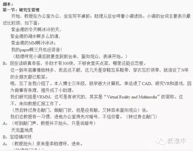 在潘志庚教授的新浪博客里面,甚至还有一部他自己创作的小品《教授难当》的脚本:
