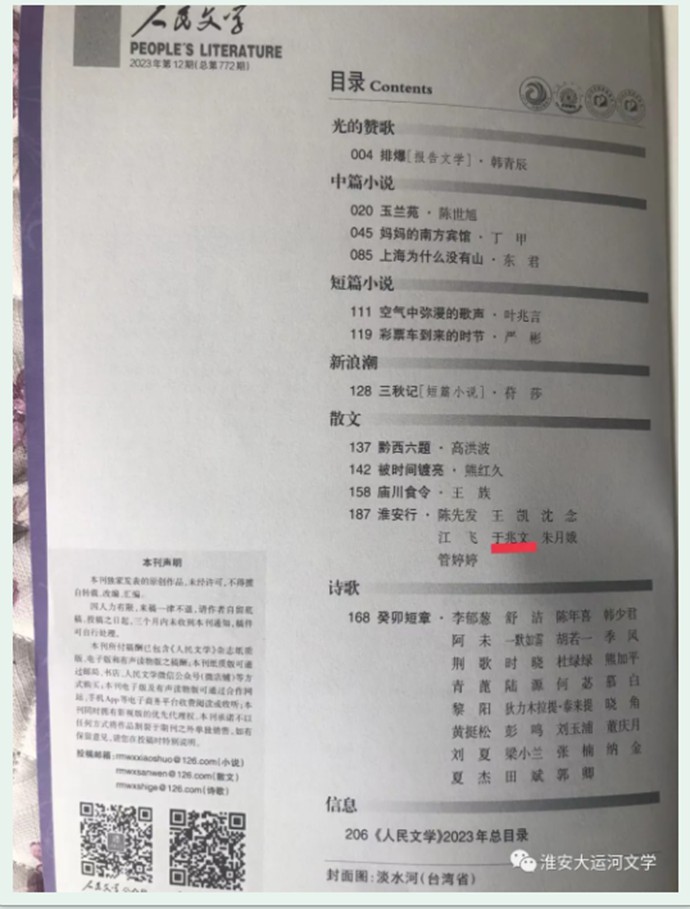 编者按:2023年第12期《人民文学》重磅推出中国作协会员,淮安区作协主席于兆文抒写淮安运河的散文《运河行吟》,一经发表便引起广泛关注。现全文转载,以飨广大读者。