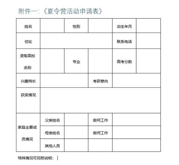 有意向的同学需在7月25日前,如实填写《夏令营活动申请表》(附件一),并附上准考证、录取通知书(或录取电子截屏)等相关材料的PDF格式扫描件,压缩打包后发送至邮箱469736827@QQ.com。