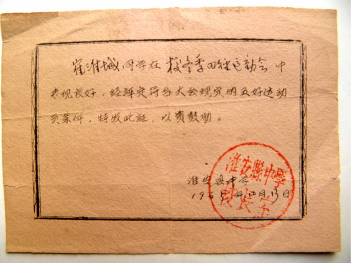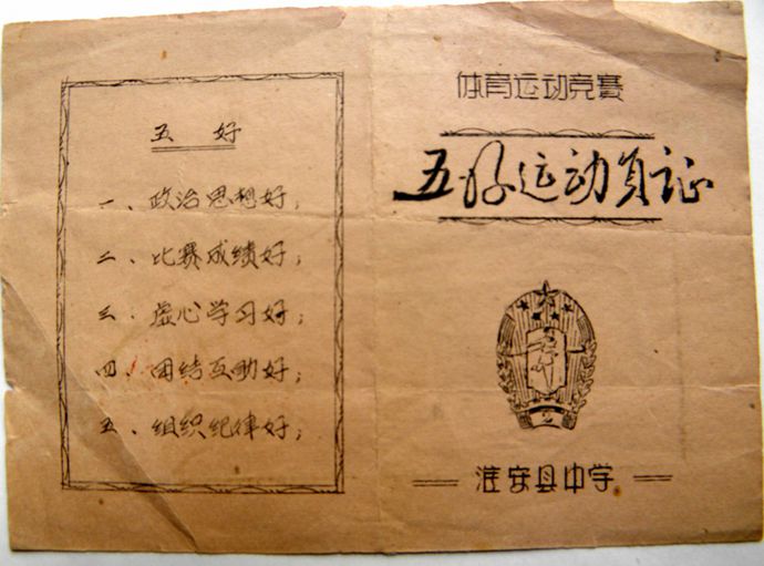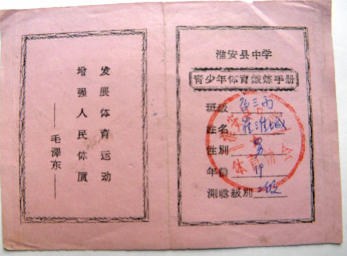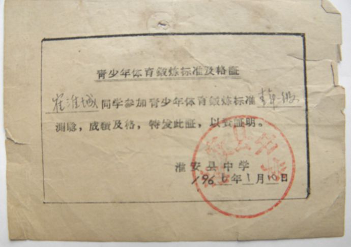 我现今还珍藏着一张10×13.5厘米、由“淮安县中学校长室”1965 年 12月发给的《体育运动 五好运动员证》。并盖有“淮安县中学校长室”(直径为 3.5 厘米)圆形印章 。