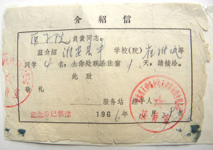 其二,是由“河北省天津市外地来津革命师生服务站”1966年11月 29日开给的《住宿介绍信》,并盖有“纪念章已供津”的长方形红印章。
