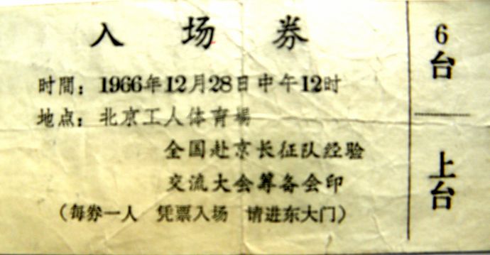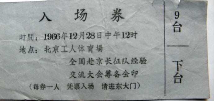 《全国赴京长征队经验交流大会北京工人体育场入场券》(1966年12月 28 日)