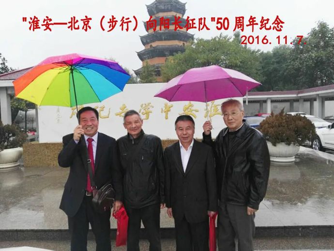 在学校的“文革”期间,提到锻炼身体,最值得回忆的,当数我参加的“步行长征串联”。在当时所谓“学生大串联,乘车不要钱”的大环境下,1966年11月7日,我和高三(乙)班温鲁(班长)、周荣发和陈怀东三位同学响应党中央和国务院提倡“步行串连”的号召,组成“向阳步行长征队”我任队长,温鲁是团小组长,实行步行长征串联。自己背着行李和日用品的背包,举着队旗,每天步行几十千米,自始至终总共用了26天时间,走了大约1000千米,从淮安市淮安区一步一步地走到北京。既沿途学习、增长了不少生活常识、历史知识和革命经验(例如在孟良崮山下的李家庄,参加“毛泽东思想大学校”的开校学习,还听取“老新四军”关于“孟良崮战役”的历史回顾等),扩大了社会知识面,而且更难能可贵的是对我们的体质和意志方面进行了一趟实实在在的磨炼。在这项活动中,我现今还保存着几份相关资料。