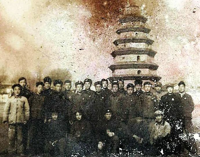 1968年3月5日我淮安县中学1966届高三(丙)班部分同学为送3同学入伍在学校文通塔旁篮球场上合影