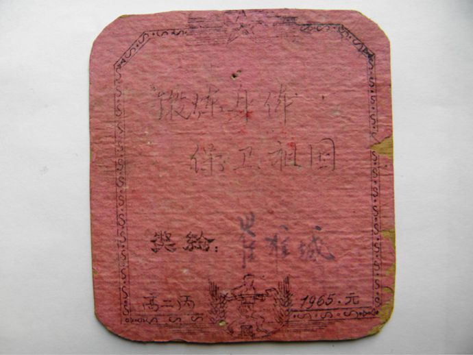 我现在家中的个人档案资料里还保存着一张高二(丙)班1965年1 月发给自己的“班级壹级运动员”《奖励证》,大小为 9×8.3 厘米,中间是马粪纸板,正面贴有大红纸,上有同学们手工刻划的、油印机印刷的“五角星”“劳卫制证章”的标记、“锻炼身体 保卫祖国”的宣传语和装饰花边,发证单位是“高二(丙)”,发证时间是“1965.元”,“奖给”的后面是用钢笔填写的“崔淮城”三个字。