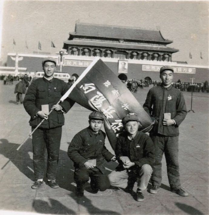 1966年12月26日上午,崔淮城与温鲁、周荣发及陈怀东4名“淮安-北京向阳步行长征队”将队旗献给中南海毛主席生日前,在天安门广场上合影