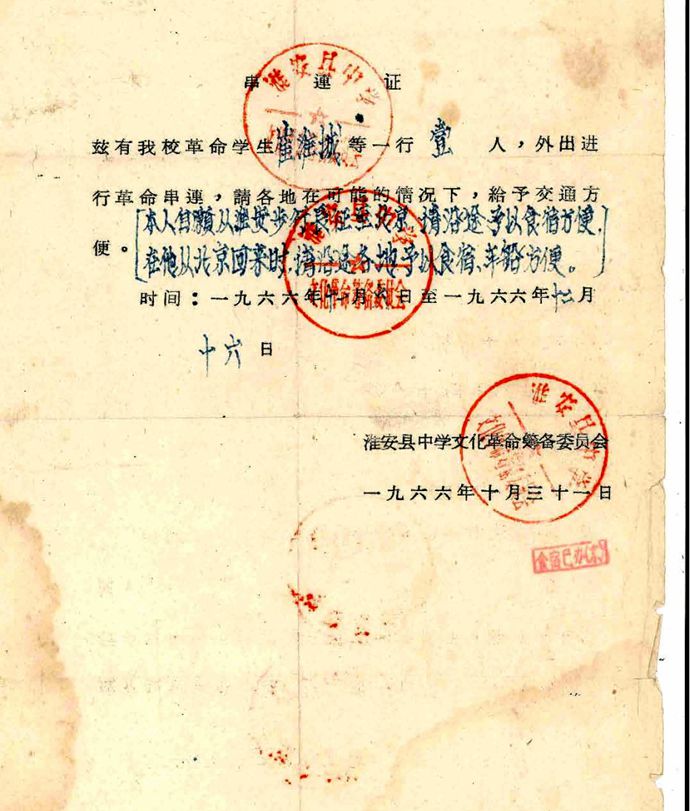 其一,是淮安县中学文化革命筹备委员会 1966年10 月31日开给的《步行长征串连证》(这是准备自己在单独串连活动时使用的)和残存的“向阳步行长征队”初拟淮安—北京一路行径文字计划及草图,此证上还盖有“食宿已办(京)”的红印章。