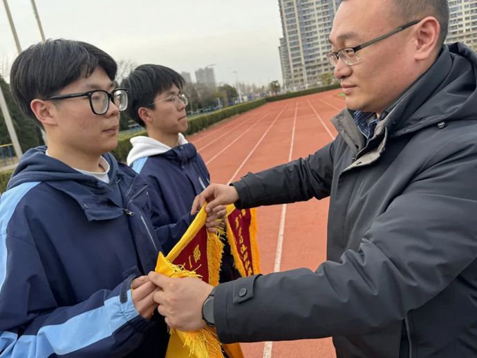 年级领导为获得学习优胜班集体称号的班级颁发流动红旗。