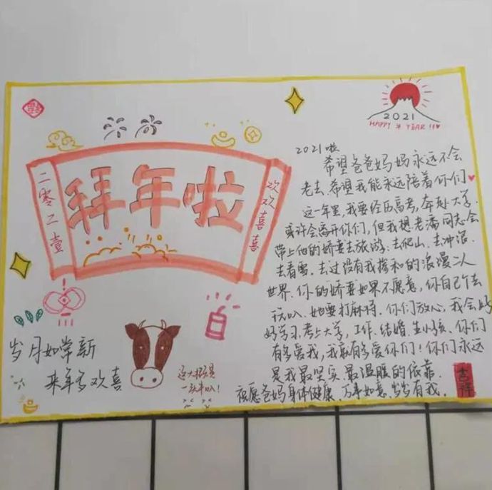 陆游在《除夕夜》里写道“半盏屠苏犹未举,灯前小草写桃符”,除夕前家家户户贴春联,表达一家人对新春的美好祝福,江苏省淮安中学高三Ⅱ部的广大学生也精心手绘了一张张新春贺卡,描绘了属于我们自己的新年愿景。