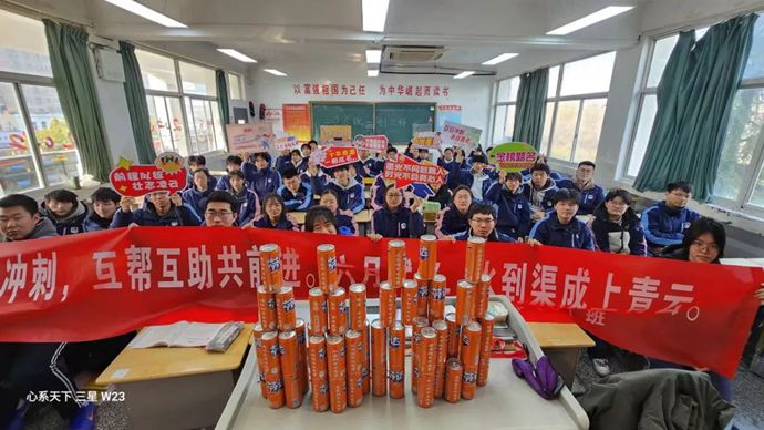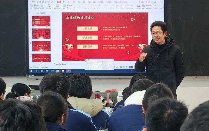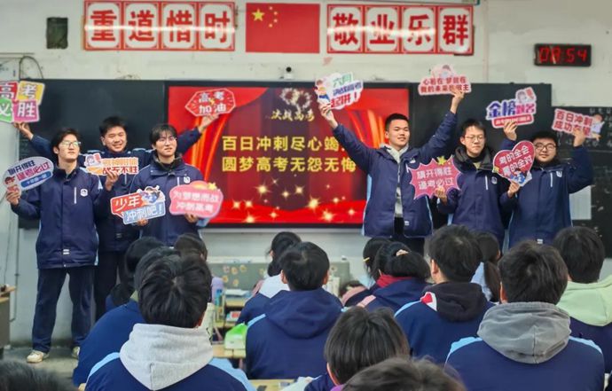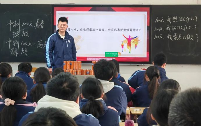 接着,各个班级的班主任结合本班实际情况,开展了各具特色的主题班会。有的班级的班主任从“百日冲刺意味着什么”、“一百天可以做些什么”等方面和学生进行交流探讨,过程中不时邀请同学上台畅谈各自的想法;有的班级邀请科任老师给同学们加油鼓劲;有的班级提前请家长录制了给孩子们的加油视频;有的班级准备了小卡牌,用简短的口号喊出自己强有力的信心;有的班级请同学们上台演唱,用歌声表达了自己冲刺高考的决心。