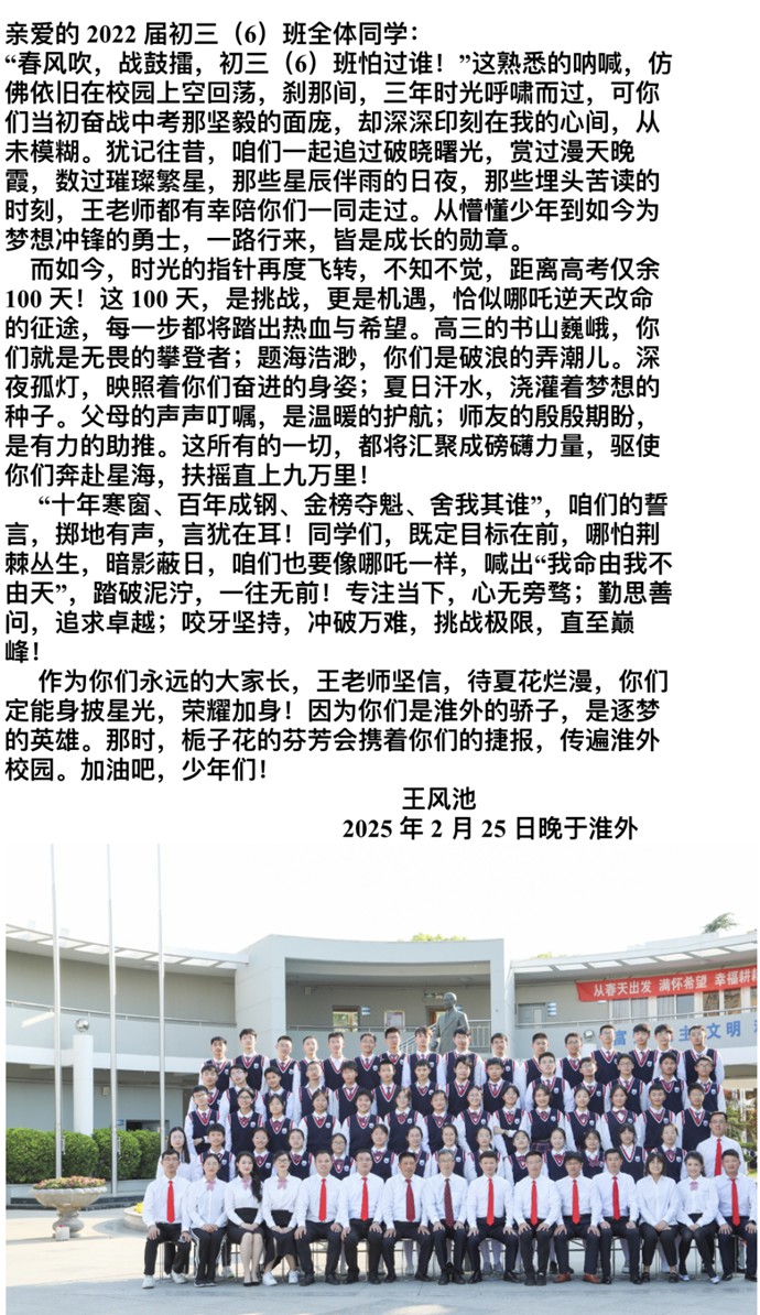 在这个特殊的日子里,高三II部5班的两位同学还收到了来自初三班主任——淮安外国语学校王风池老师的一封鼓励信。信中说,“王老师坚信,待春花烂漫,你们定能身披星光,荣耀加身!”三年荏苒,再度感受到曾经班主任的殷殷关切,让热血的“百日冲刺”日又添一分感动,也让同学们更有动力,“挑战极限,直至巅峰”!