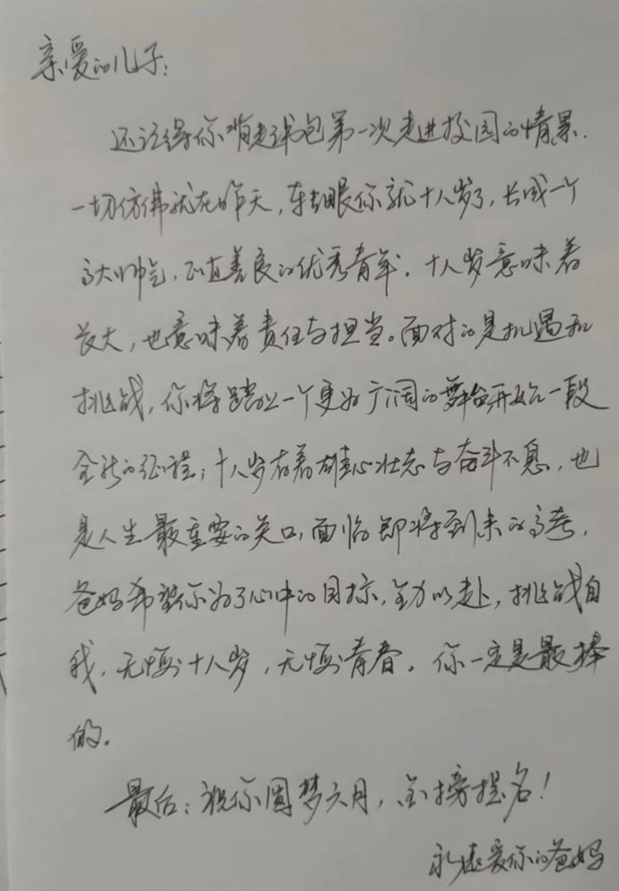 我的长大也伴随着父母的衰老。感谢母亲18年的陪伴,也敬佩父亲为祖国做出的贡献。希望成人后,能做一个有出息的好公民,不辜负父母的期望。