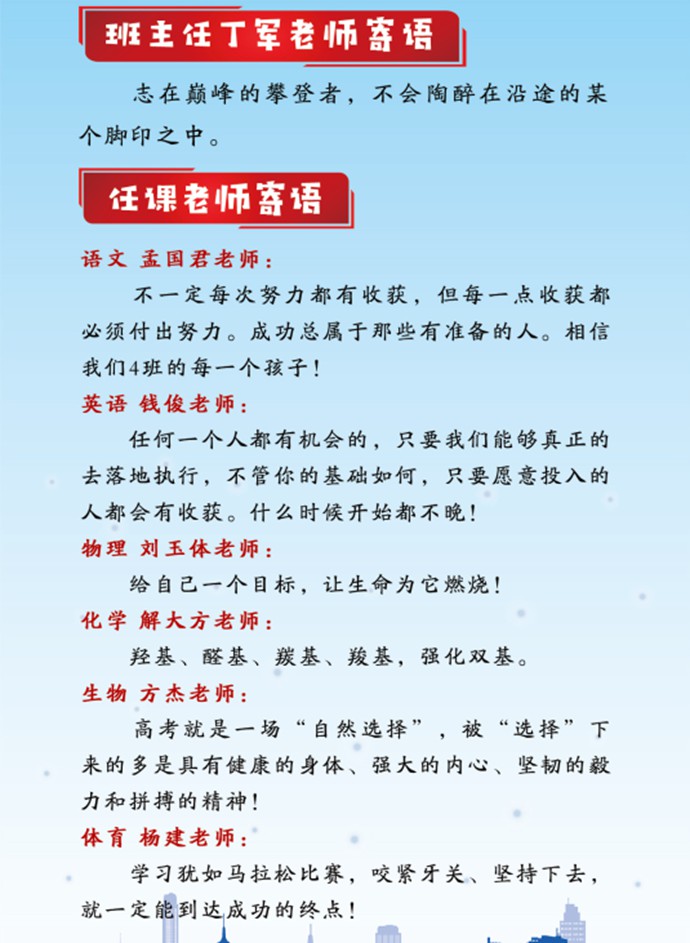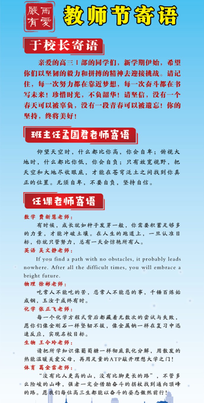 寄语中有于敏校长充满深情的期待:“亲爱的高三I部的同学们,新学期伊始,希望你们以坚韧的毅力和拼搏的精神去迎接挑战。请记住,每一次努力都在靠近梦想,每一次奋斗都在书写未来!珍惜时光,不负韶华!请坚信,没有一个春天可以被辜负,没有一段青春可以被遗忘!你的坚持,终将美好!”有班主任的殷切希望:“愿同学们都做生活的强者,自信略管,勇毅前行”“放宽视野,把天空和大地尽收眼底,才能在苍穹泛土之间找到你真正的位置。无需自卑,不要自负,坚持自信”……有各科老师的祝福:“每个化学方程式背后都藏着无数次的尝试与失败”“请把所学知识像葡萄糖一样彻底氧化分解”“物理之钥,解锁宇宙”……