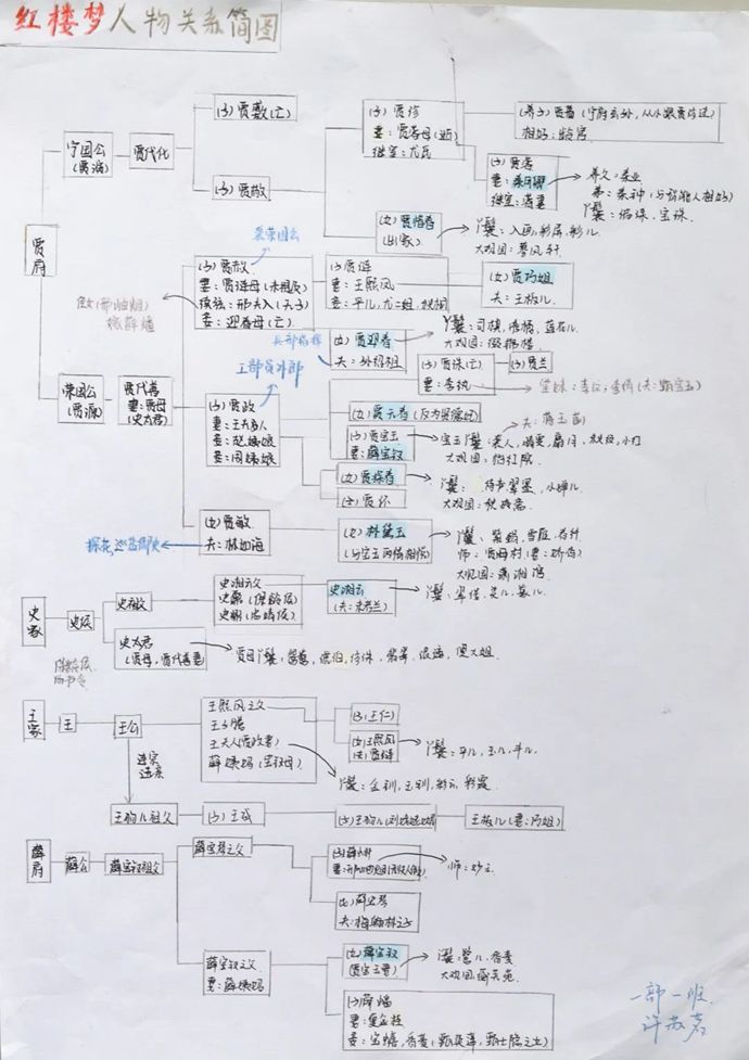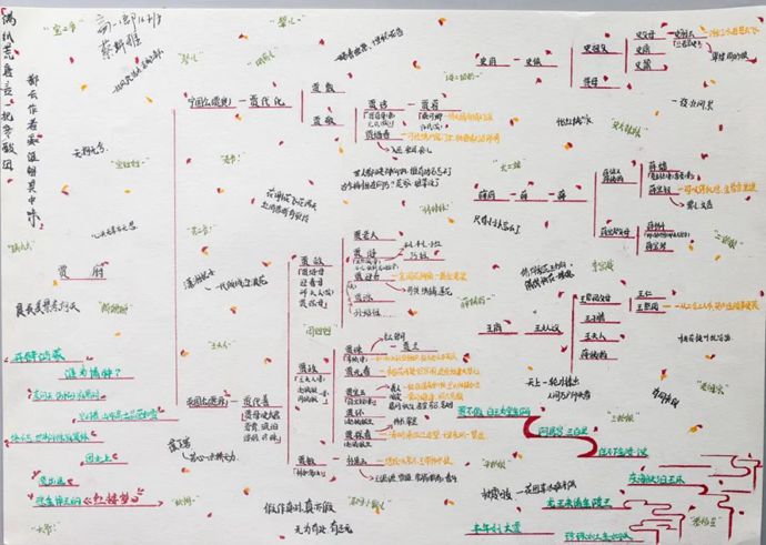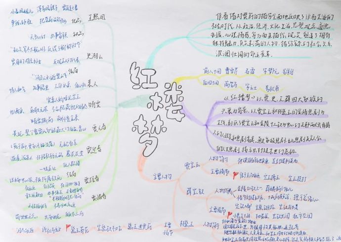 如果说手抄报是感性的艺术呈现,那么一张张逻辑清晰的《红楼梦》思维导图则展现了同学们理性思辨的深度。从“四大家族关系网”到“贾府兴衰时间轴”,从“人物性格关键词云”到“诗词意象分类图谱”,同学们用线条与关键词抽丝剥茧,将这部鸿篇巨制的复杂脉络梳理得清晰可触。李同学感慨道:“画导图时,我忽然发现曹雪芹连丫鬟的名字都暗藏玄机——‘袭人’是花香袭人,‘麝月’对应宝镜,原来每个人物都是一把打开主题的钥匙!”思维的碰撞让经典阅读不再是“雾里看花”,而成了探索与发现的奇妙之旅。