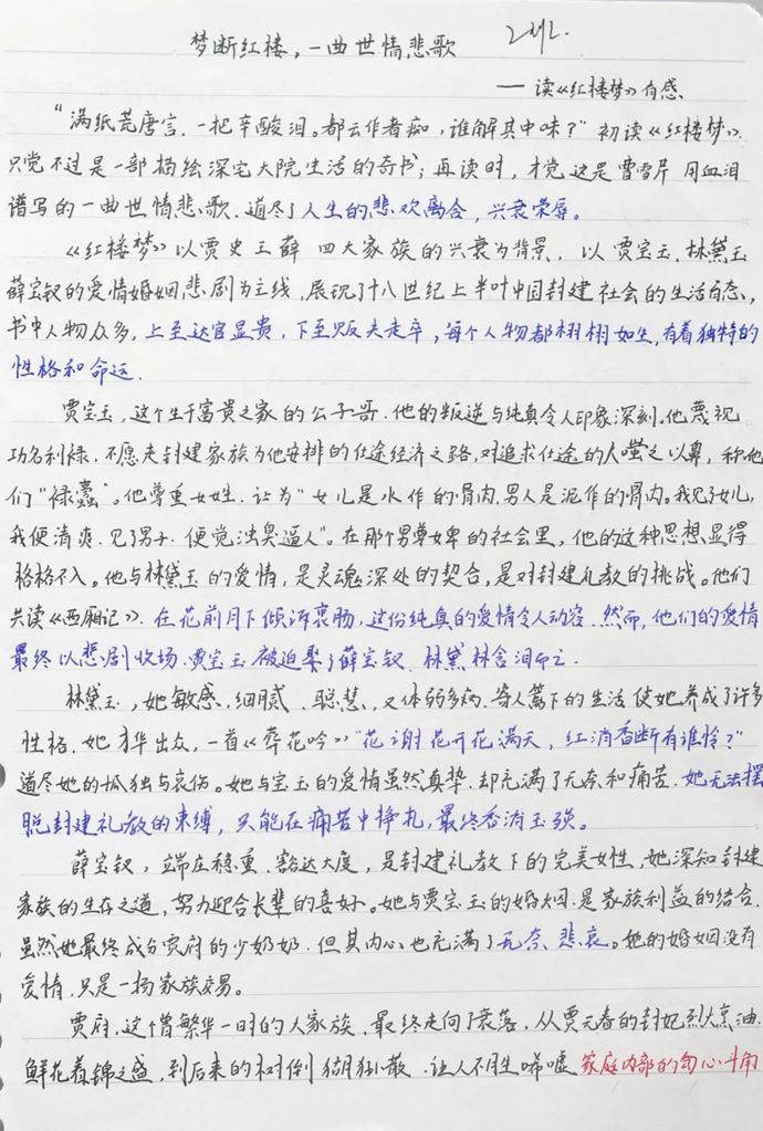 经典不老,青春正好。当少年遇见《红楼梦》,我们看到的不是“读不懂”的焦虑,而是“再创造”的惊喜。他们用笔墨诠释经典,用思考对话人生,这正是文化传承最动人的模样。春日的校园里,红楼一梦暂醒,但书香永驻。愿这份对经典的敬畏与热爱,如三月新芽,在少年心间生生不息;愿每一场与书的相遇,都能成为照亮生命的一束光。