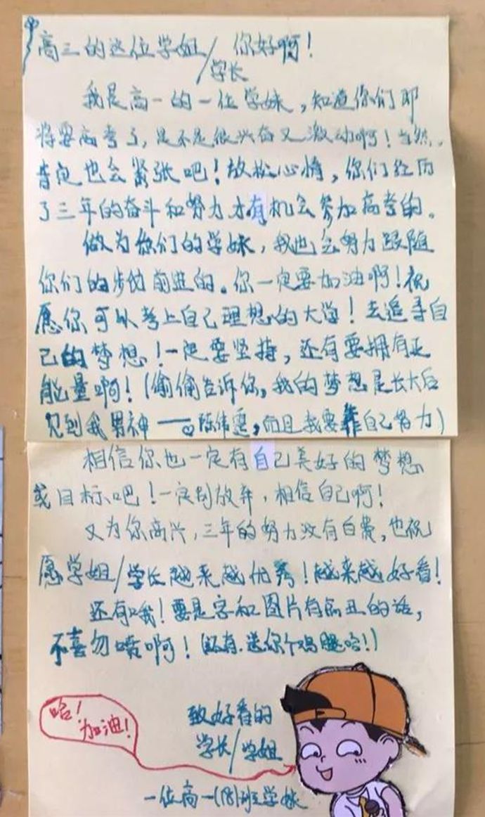 高考来临之际,高一1部同学们为高三的学姐学长们准备了一份特殊的礼物。这份礼物寄托了孩子们真诚的祝愿,他们衷心地祝愿学长学姐们金榜题名;这份礼物同样承载了他们两年后梦想的希冀,希望自己也能像学长学姐们一样载梦出航,在高考这没有硝烟的战场上所向披靡!