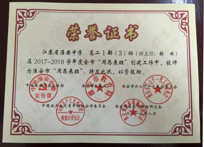 近日,传来喜讯,江苏省淮安中学原高二1部3班(班主任:张欢)和原高二2部12班(班主任:张巨康)被授予2017-2018学年度淮安市“周恩来班”荣誉称号,原高一1部7班(班主任:周学科)被授予2017-2018学年度淮安区“周恩