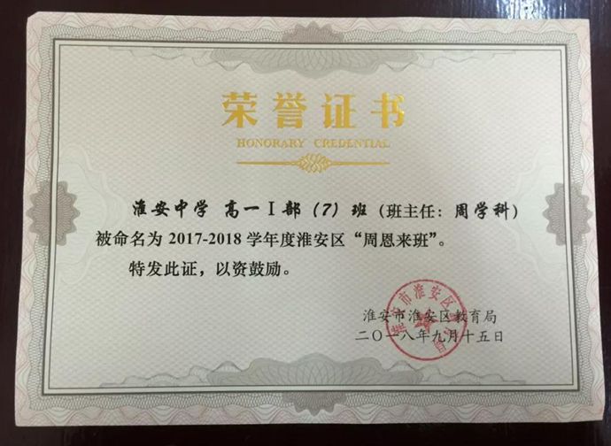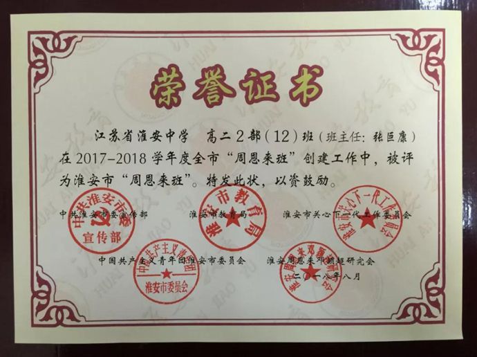 近日,传来喜讯,江苏省淮安中学原高二1部3班(班主任:张欢)和原高二2部12班(班主任:张巨康)被授予2017-2018学年度淮安市“周恩来班”荣誉称号,原高一1部7班(班主任:周学科)被授予2017-2018学年度淮安区“周恩来班”荣誉称号。