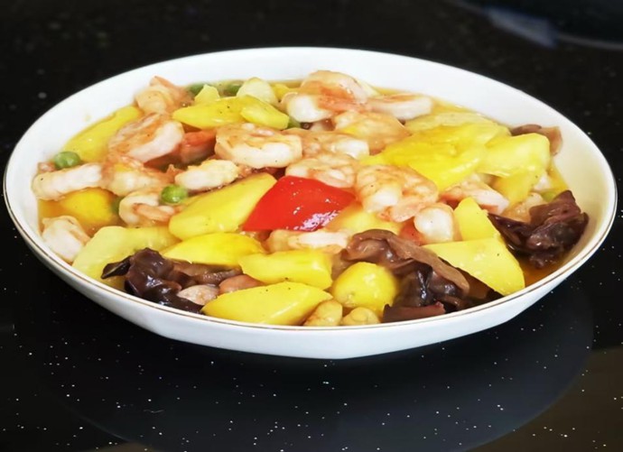 4.加入菠萝块,快速翻炒,加盐调味,盛出即可食用。
