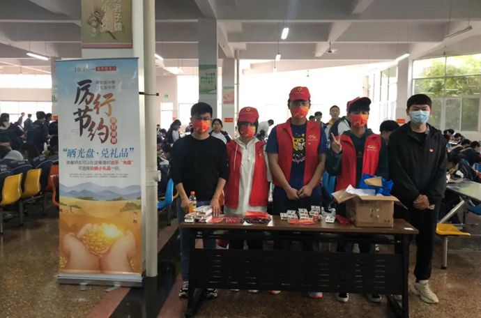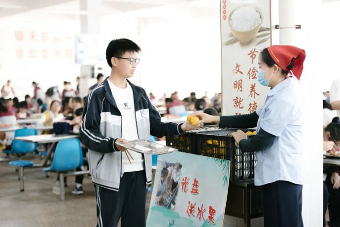 10月17日中午,我校在食堂餐厅开展了“光盘送水果”活动,就餐的学生凭“光盘”都可以免费领取一份水果。