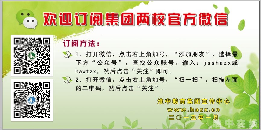 欢迎关注集团两校官方微信公众号 作者: 发布时间:2015-01-06 16:36:06 浏览次数: 订阅方法: 1、打开微信,点击右上角加号,"添加朋友",选择最下方公众号,查找公众账号,输入:jsshazx或 hawtzx,然后点击“关注”即可。 2、打开微信,点击右上角加号,"扫一扫",扫描左面的二维码,然后点击“关注”。
