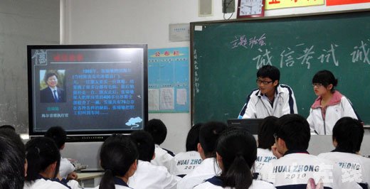 在高一(1)班,徐彬老师围绕“诚信考试,诚信做人”主题,通过多媒体介绍了诚信相关知识,鼓励同学们“诚信做人,踏实做人”。在本次班会上,同学们纷纷介绍了诚信方面种种事例,就“中学生应在哪些方面培养诚信”发表许多的意见。本次班会立意新颖,设计巧妙,对学生的学习和生活极富启迪教育意义。校学工处主任周淑琴在高一(1)班做了精彩的即席点评,赢得了全体师生的一致好评。