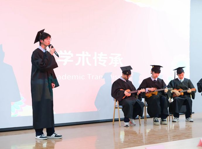 随后,毕业生们精彩的尤克里里表演《上春山》将现场气氛推向高潮,同学们用欢快的音乐,向高中阶段的青春岁月致敬。紧接着,屏幕上视频的播放,将观众带入了一段段熟悉的回忆。视频中的每一个瞬间,大屏幕上闪过一张张青涩的脸庞:课堂上的专注眼神、实践活动的创意迸发、舞台上的投入表演、竞赛场上的从容不迫……从懵懂少年到自信青年,每一帧画面都是成长的印记。时光在此刻重叠,青春的热烈与纯粹永不褪色。