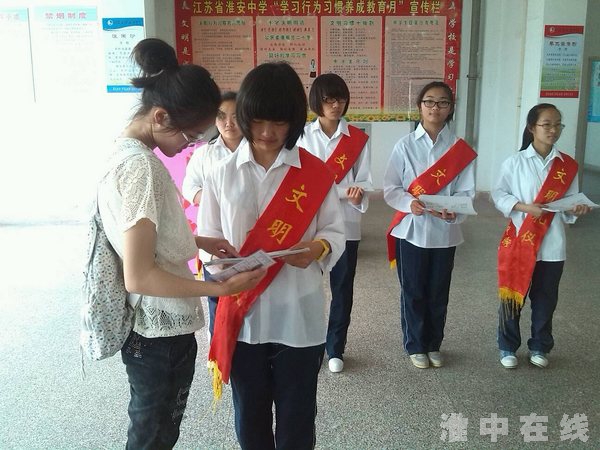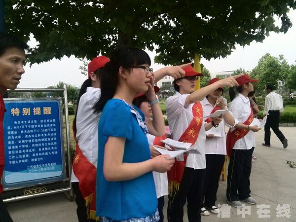 “请问,**考场怎么走?”一位女生抱着书,眼角流露出焦急的神色。我们拿出一张示意图,认真地告诉了她具体位置?!靶恍唬媸切恍唬 苯鲂∈?,这样的对话从未停止。我们也从刚开始的紧张,到了后来的落落大方。我们洒下了汗水,收获了考生的感谢。我们传递微笑,收获了考生的安心。我们播种真挚,收获了考生的信任。“不愧是淮中,志愿者真不错!”、“你们辛苦啦!”这样的赞叹和感谢不绝于耳,每当听到这些话时,酸痛感会立马消失,我们又重新精神抖擞起来。