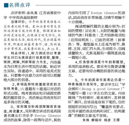 6月8日,江苏省淮安中学英语名师宗凤昌应《扬子晚报》约稿,对2008年江苏高考英语试卷进行评析。以下是发表在6月9日《扬子晚报》A2版的稿件全文: