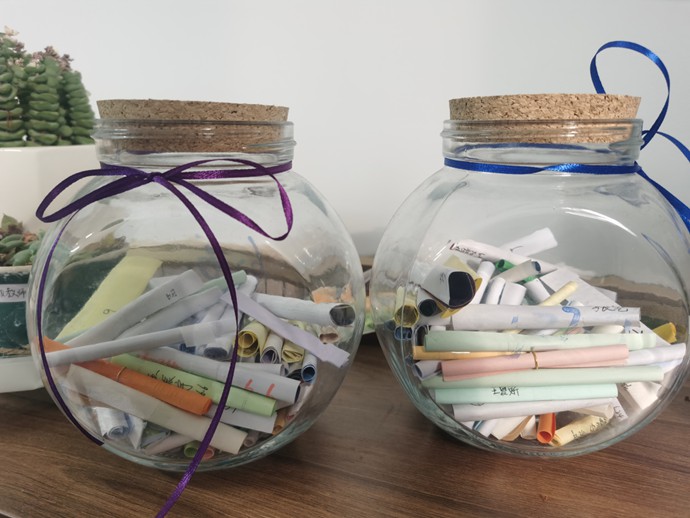 我买了两个许愿瓶和63张彩纸,让学生分别写给6月6日和6月24日的自己各三句话,写好后放在许愿瓶里。6月6日是高考的前一天,我们约定在6号的那个小班会课打开,给予他们考前心灵上的鼓励;6月24日是高考成绩放榜的那天,当学生再次看到高三刚开始时写给自己的三句话的时候,一定有很多感慨。既是约定,也是对当下学生心灵的一种沉淀与洗涤,一种使命感和美好的期待感支撑着他们去努力,去行动,去奋斗。