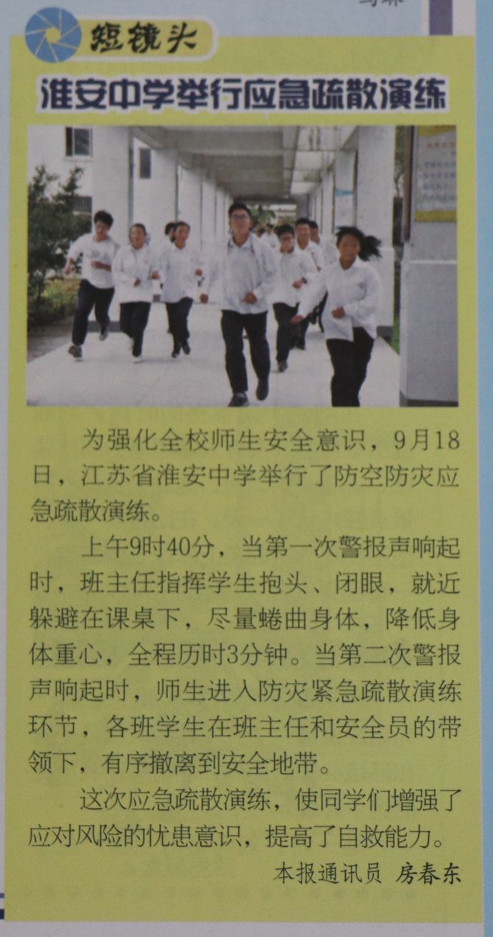 《中国中学生报》报道我校应急疏散演练 作者:房春东 发布时间:2018-10-24 08:35:49 浏览次数: 2018年10月2日,《中国中学生报》5版报道了我校应急疏散演练。《中国中学生报》是由中国共产主义青年团中央委员会主管,中国少年儿童新闻出版总社主办。