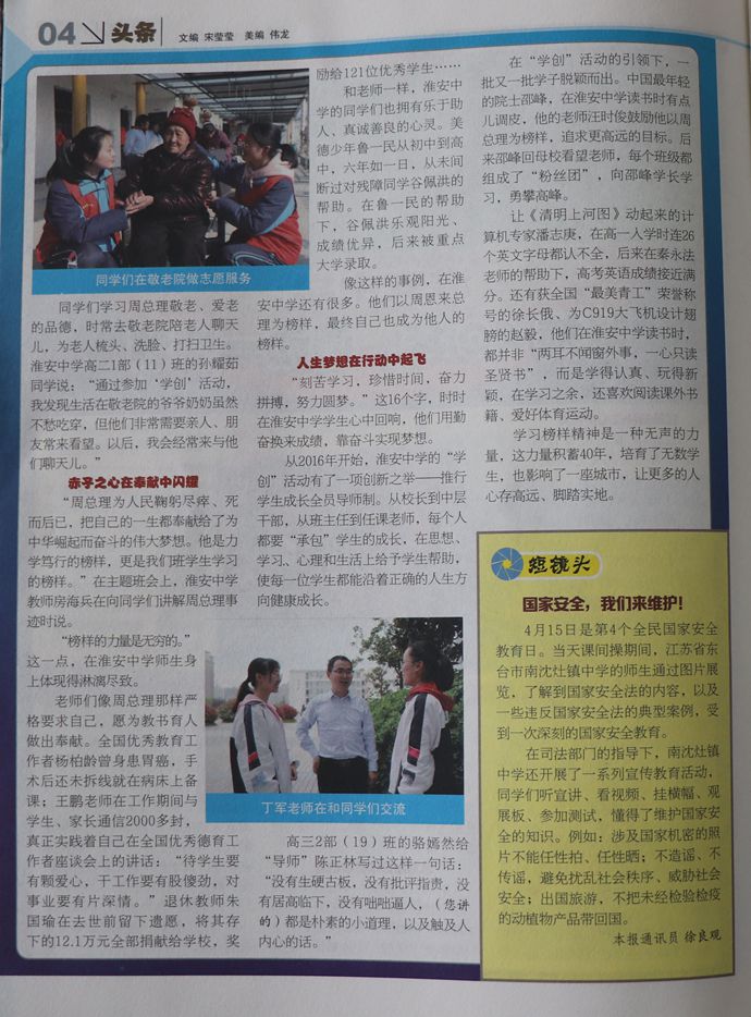 像这样的事例,在淮安中学还有很多。他们以周恩来总理为榜样,最终自己也成为他人的榜样。