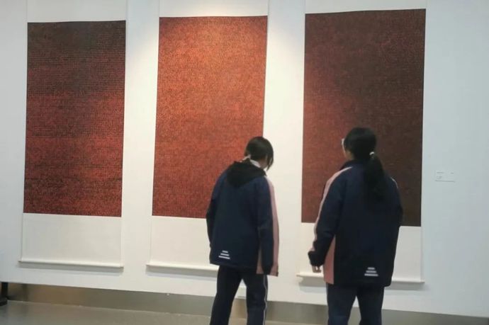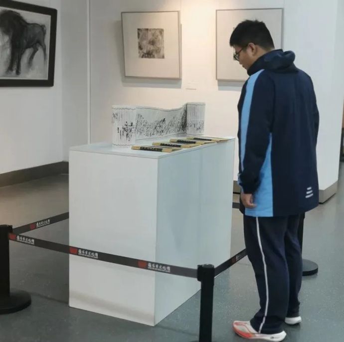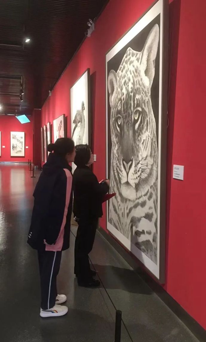 接着,同学们又在老师的带领下来到了市文化馆,欣赏了正在这里举办的“纸上乾坤”中国当代纸艺巡回展。展览汇聚了纸艺术创作领域具有代表性的30余位中外艺术家的作品,这些作品以纸为“媒”,多维度、多层面地呈现了对当下现实生活的不同认知与各样感受,以丰富多彩的方式阐释了鲜明的艺术态度和文化立场。同学们满怀兴奋与崇敬,认真专注地观赏一件件作品。