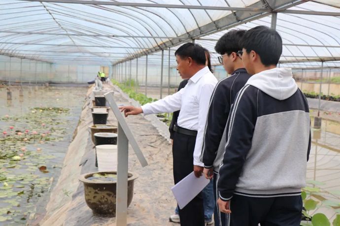接着,同学们走进荷花栽培基地,观赏美丽的荷花,了解荷花的生长。中心负责人赵峰喜和董玮老师向同学们介绍了荷花的品种和生长情况,并指导同学们动手栽植荷花。同学们都是第一次到专业的荷花研究中心参观学习。他们认真学习,积极动手,不断探索。