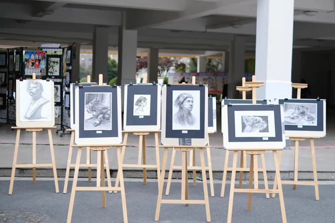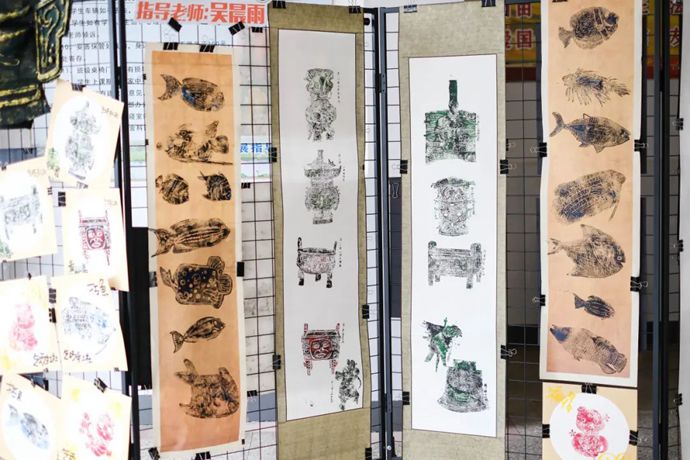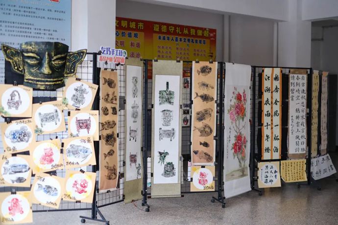 活动伊始,吴晨雨、张建华、李少红等老师带领社团的同学们开始了紧张而有序的筹备和布置工作。他们精心设计了展览的布局,设立多个专栏,如手工版画、绘画书法、绘画互动体验等。每个专栏都由相应的社团成员负责,他们用自己的作品和创意,为展览增添了丰富的内涵和艺术气息。