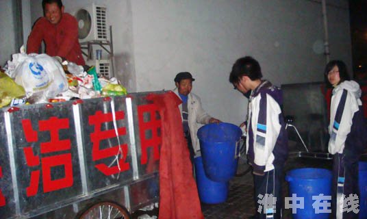 3月30日晚7时,记者到江苏省淮安中学采访,刚进校门,发现一群学生冒着小雨,抬着垃圾桶,把垃圾送到清洁车上。每天这个时间,学生们总会清理一天的生活垃圾。也正是由于学生爱护环境,学校加强环境卫生的管理,使得学校环境整洁美观。