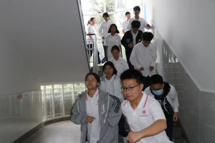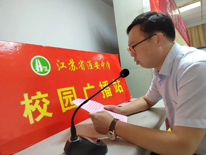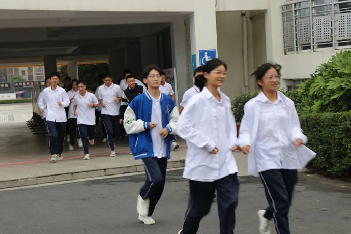 第二项进行的是防灾演练。8点38分,刘春明副主任利用广播室发出火灾信号,下达命令:“全体师生注意,现在发现某教室产生火情,全校师生立即到位,江苏省淮安中学防灾疏散演练现在开始。”班主任立即组织学生按照教室和楼道疏散示意图有序离开教室,各班级安全员配戴“安全员”袖章到本班级经过的楼梯口指挥疏散,各年级主任立即到本年级跑操集中地点指挥师生整队。