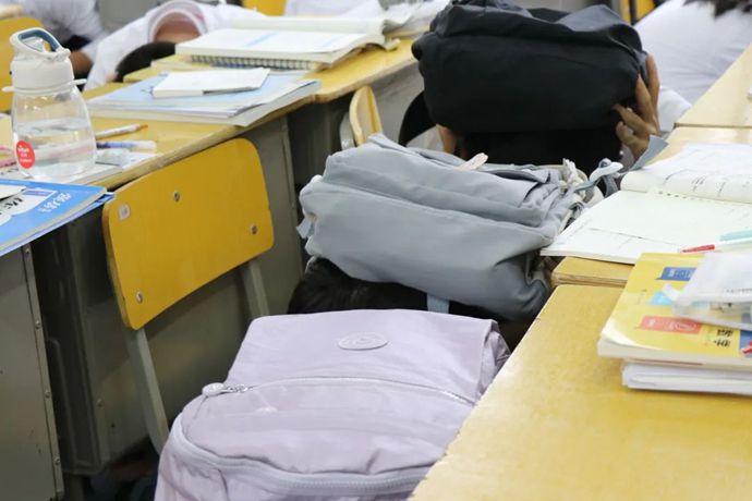第一项进行的是防空演练。8点35分,第一次防空预先警报拉响起,学生工作处副主任刘春明利用广播宣布:“老师们、同学们,江苏省淮安中学防空、防灾疏散安全演练马上就要开始,请大家做好准备。现在进行防空演练,时间3分钟,开始。”第二次空袭警报拉响起,班主任听到“开始”后,指挥学生迅速抱头,或用书包?;ね凡浚愕礁髯缘目巫老禄蚩巫琅裕×框榍硖?,降低身体重心;最后一排靠里的同学面向墙,蹲在墙角处。第三次警报解除拉响起,刘春明副主任利用广播宣布:防空演练到此结束,请同学们坐到位置上。