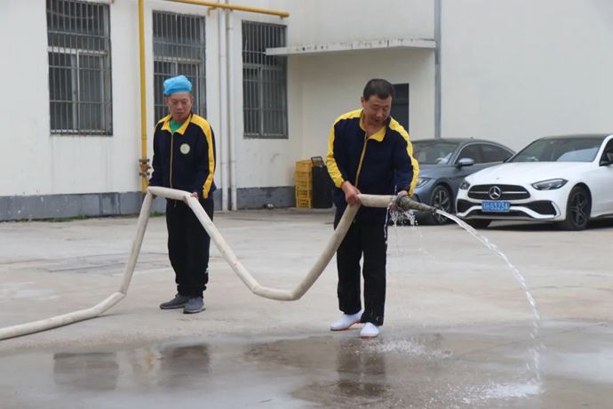 随后,消防灭火演练开始,食堂员工和保安积极参与,熟悉灭火器使用步骤,正确使用灭火器将火扑灭。接着进行了消防水带演练,员工将水带一端与消火栓连接,然后铺设水带。消火栓阀门打开后,员工握紧水枪,进行喷水工作。