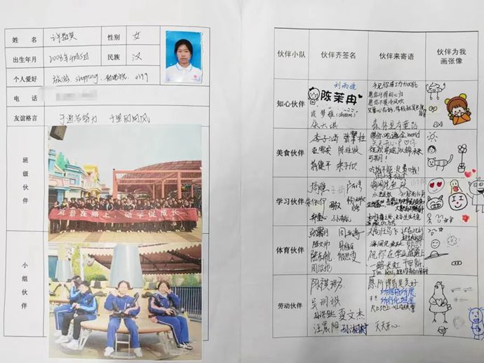 我校第十一届“要爱您”心理健康教育节主题是:平等交往、换位思考、宽以待人。学生发展指导中心以《全员伙伴制成长手册》(简称:手册)为载体,在全校学生中推进全员伙伴制。手册在“班级大家庭”和“小组天地”之外,进一步细化有:“劳动伙伴”“知心伙伴”“学习伙伴”“体育伙伴”“美食伙伴”等和生活密切相关的五个方面,通过班级合影、小组合影、伙伴寄语、伙伴为我画张像等微型活动环节,让美好的伙伴之情定格在一个个瞬间。